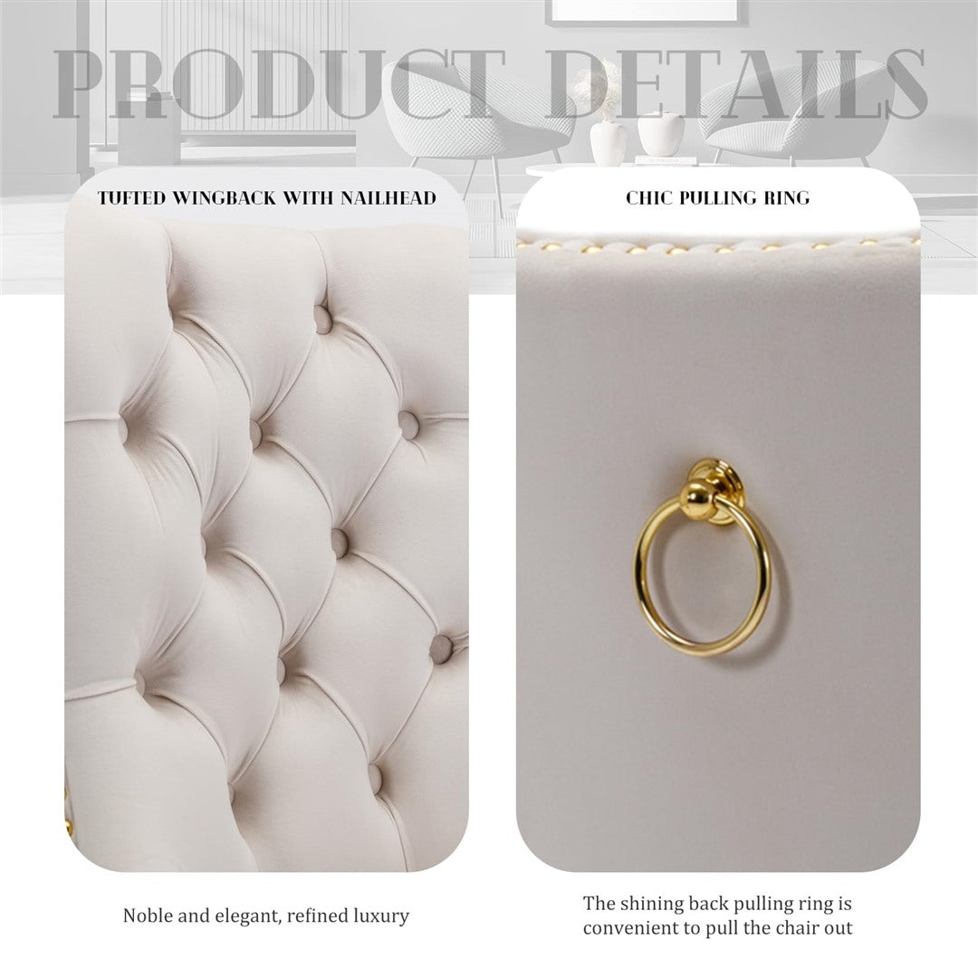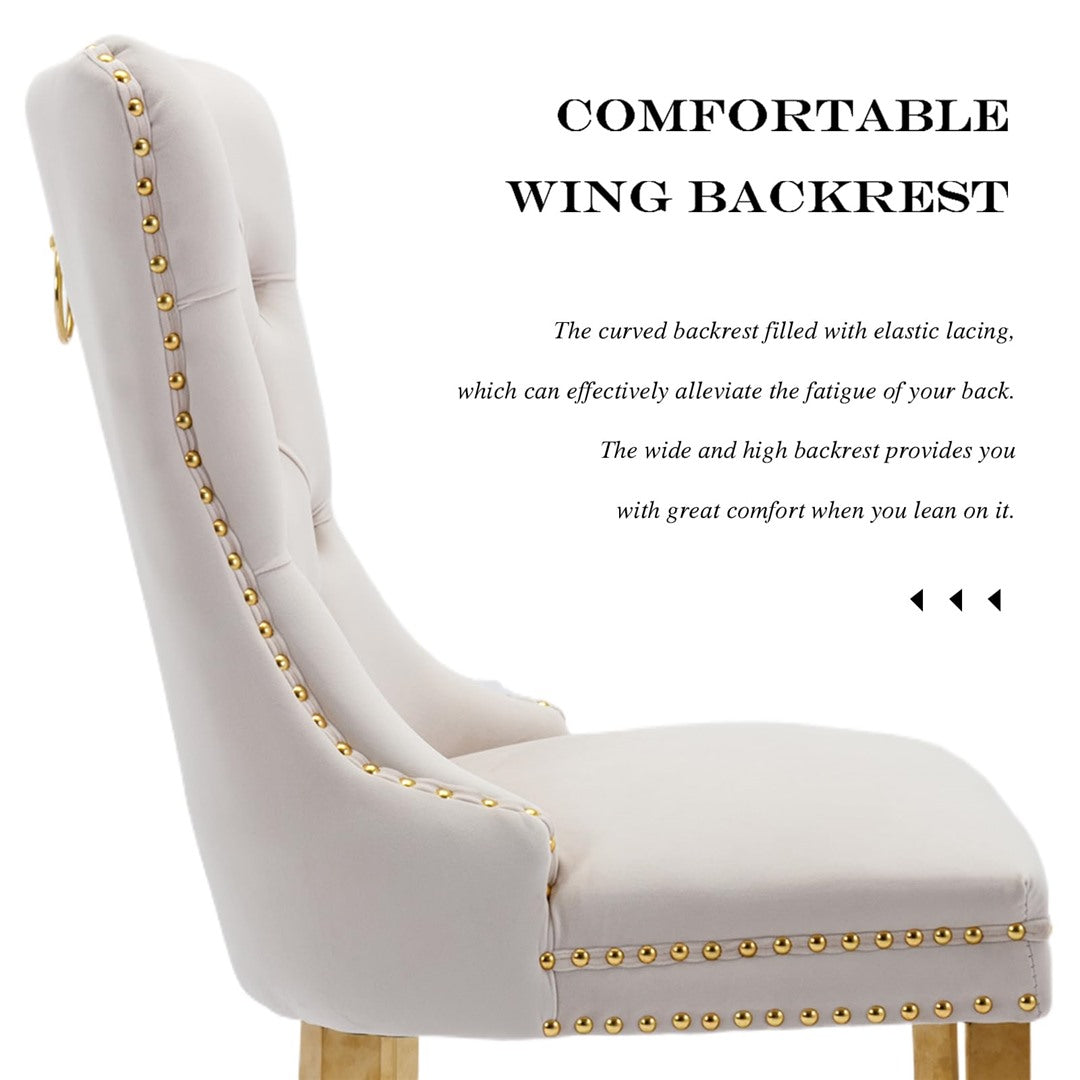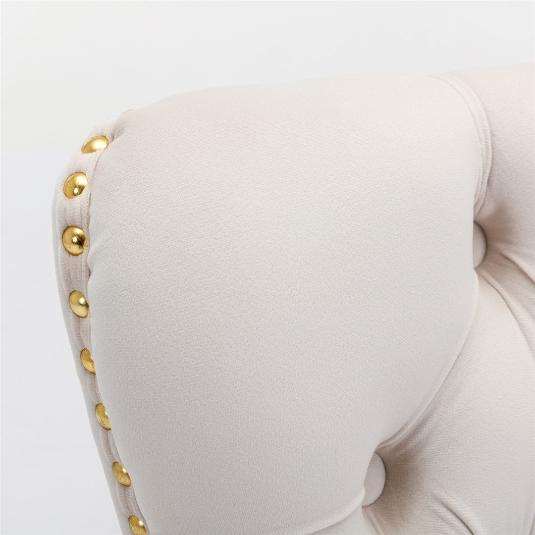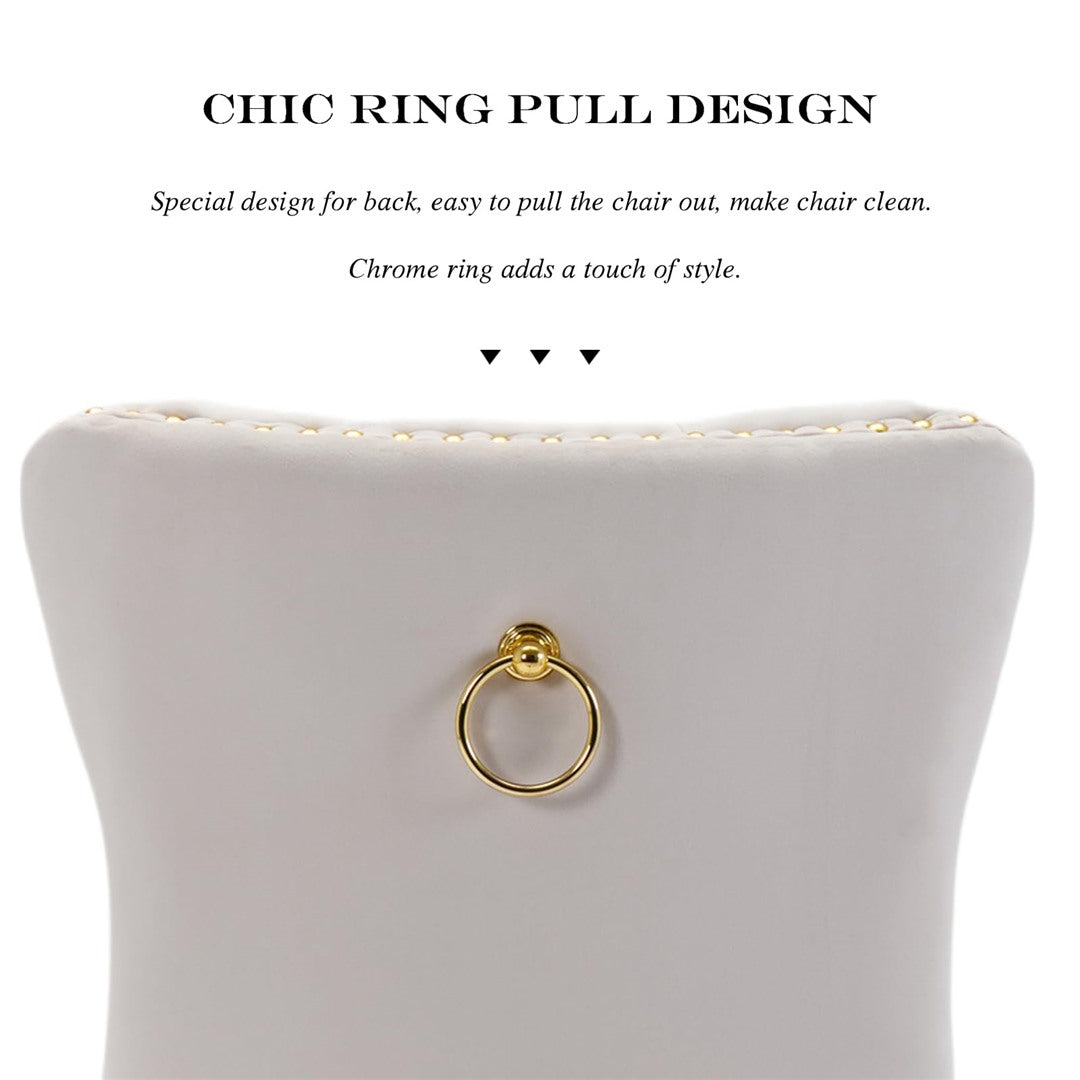 The chair's unique metal legs with gold finish, studs trim, and back pull-out ring make it a retro masterpiece, adding an extra touch of beauty to your home. These metal legs provide strong support with a weight capacity of up to 130 KGS. Small accessories at the bottom of the legs prevent sliding and scratching, ensuring the longevity of the chair.