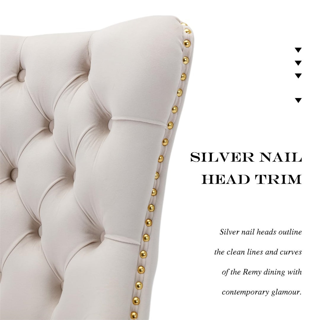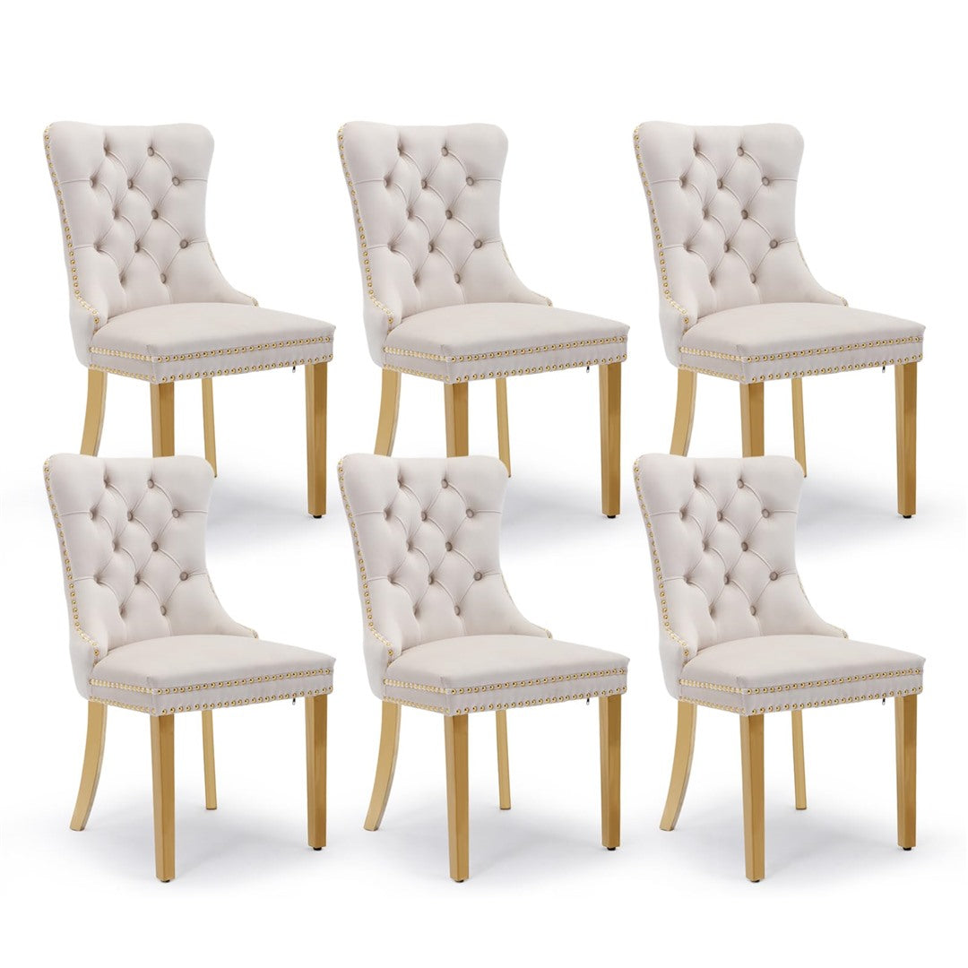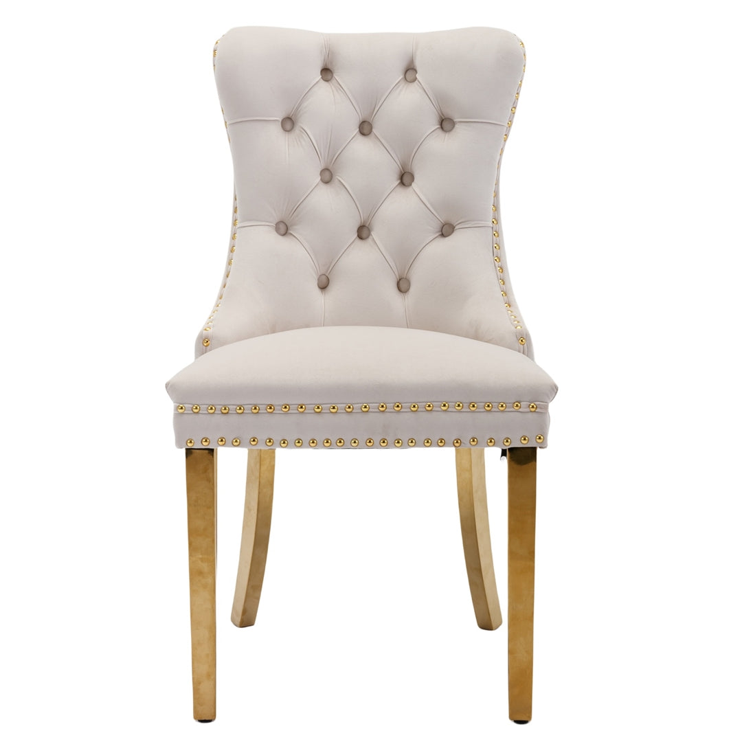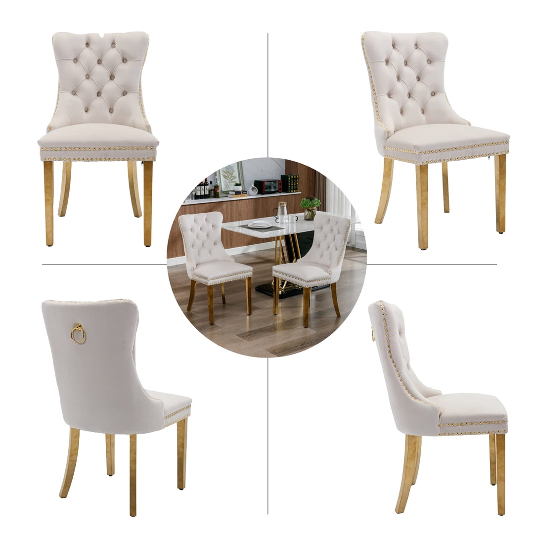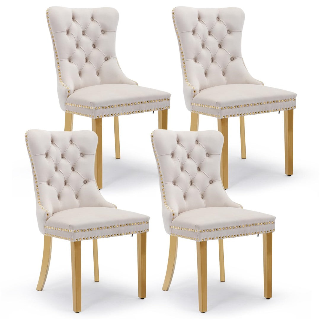 The chair's unique metal legs with gold finish, studs trim, and back pull-out ring make it a retro masterpiece, adding an extra touch of beauty to your home. These metal legs provide strong support with a weight capacity of up to 130 KGS. Small accessories at the bottom of the legs prevent sliding and scratching, ensuring the longevity of the chair.