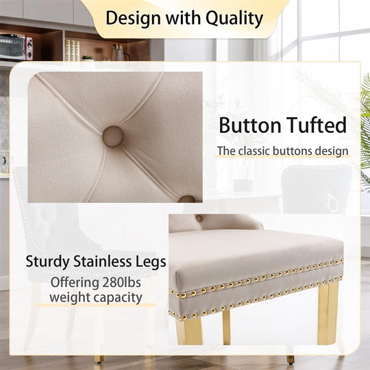 The upholstered dining chairs offer a perfect blend of comfort and elegance. The outwardly curled top edge of the backrest and thick, soft sponge padding seat ensure maximum comfort. The button-tufted design on the back cushion adds an elegant style to the chair, while the high and embraced backrest reduces fatigue and provides support to your body.