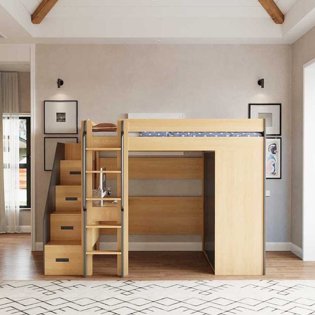 Our price includes most matching furniture in the product pictures, including a loft bed, a wardrobe, a ladder, a desk and a two-layer shelving unit (TEOM stair, mattresses, linen, and decorations not included). When assembling the loft bed, you can choose to place the ladder, stairs and wardrobe on either side.
